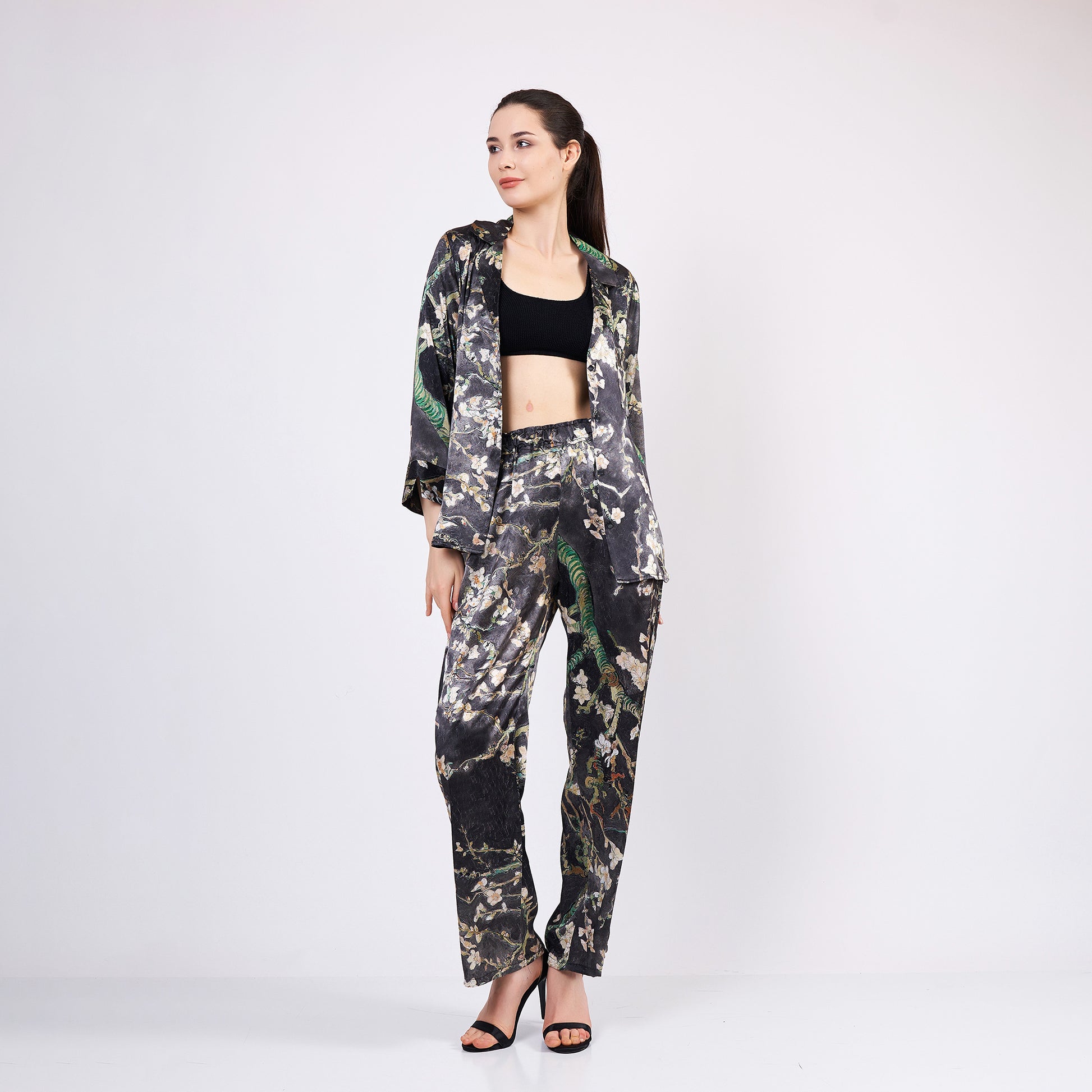 Siidist kaheosaline pikk vabaaja komplekt "Mandliõied - Antratsiit"